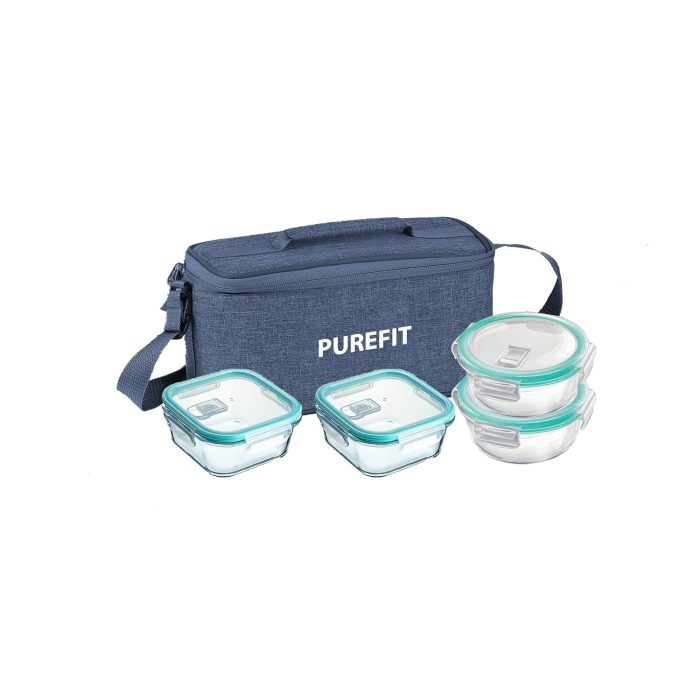 Purefit Borosilicate Glass Airtight Lunch Box – Square 320 ml*2 + Round 400 ml*2 (Multicolored Beg)